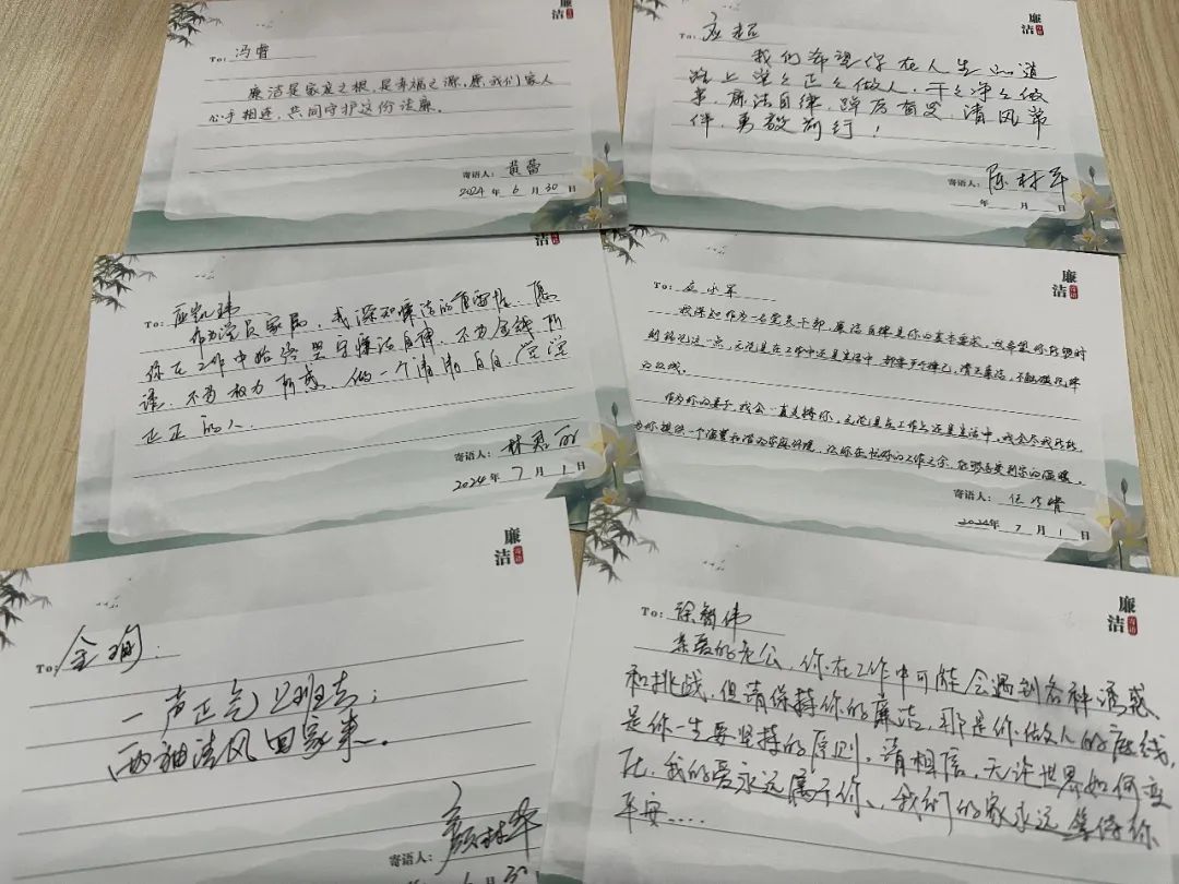 為充分發(fā)揮家庭促廉助廉作用,近期,五金城集團(tuán)黨委組織開展了家屬廉潔寄語活動,邀請集團(tuán)二級中層以上干部職工家屬在廉潔寄語卡上寫下對家人的“廉潔寄語”,共收到59份廉潔寄語。一封封“廉潔寄語”,字字珠璣、春風(fēng)化雨,傳遞了干部職工家屬們廉潔齊家的深厚期許,進(jìn)一步筑牢家庭腐敗“防火墻”,提醒黨員干部過好家庭關(guān)、親情關(guān),營造崇廉尚廉愛廉倡廉的濃厚氛圍。